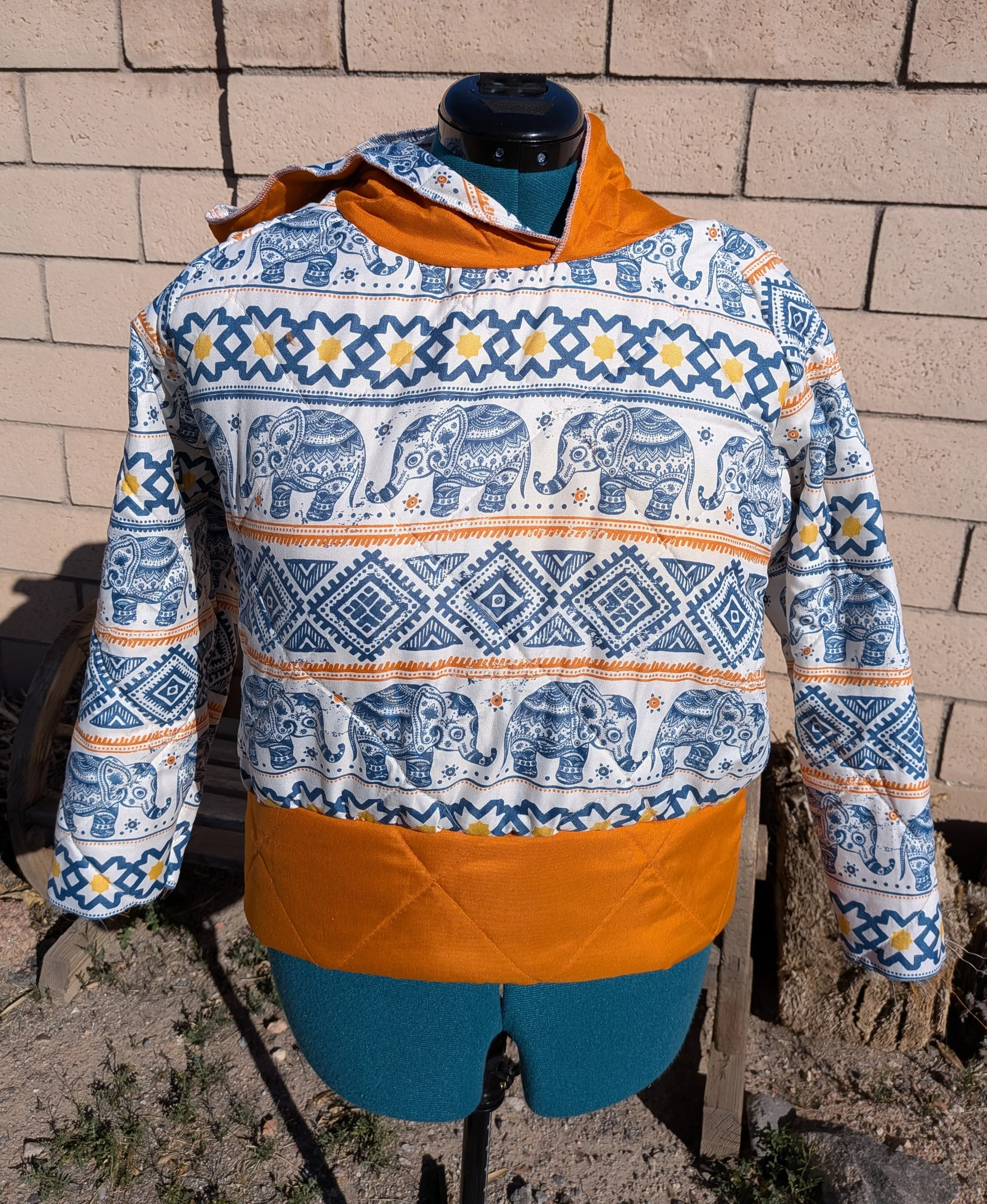 I also suspected the bottom band might have a few issues. I ended up turning it to the orange side instead of trying to match elephants on the band/sweater. I also think it tied in the orange on the hood. The band is a tiny bit snug, but then I find that often the case with the pattern itself. The band is simply sewn on and I will probably wear it at least once to see if I am going to keep the band or simply serge the sweater ends.