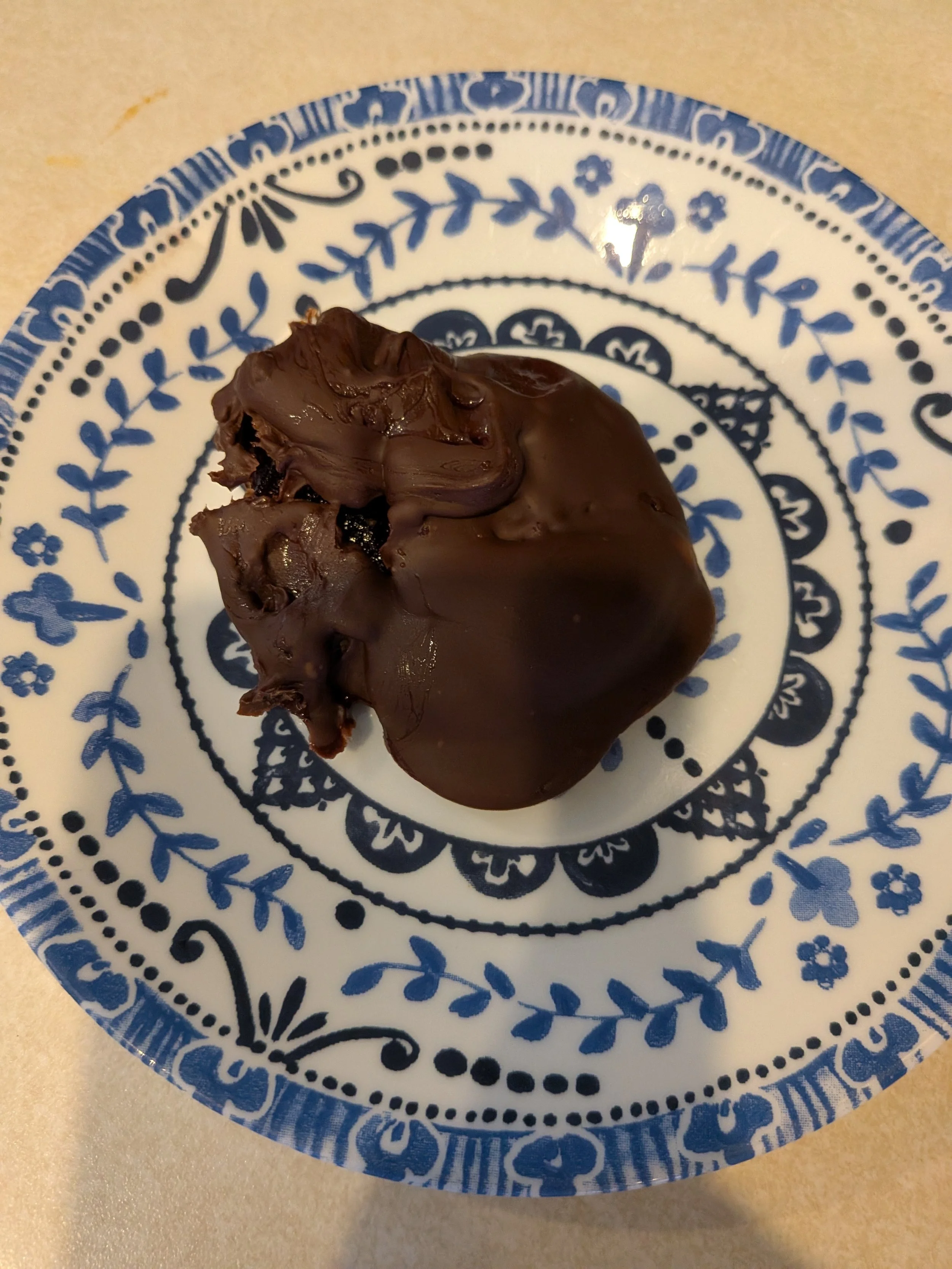 You were supposed to dry them with a paper towel. That was a semi success. I had my chocolate all prepped and ready to go. The first dip went reasonably well.
