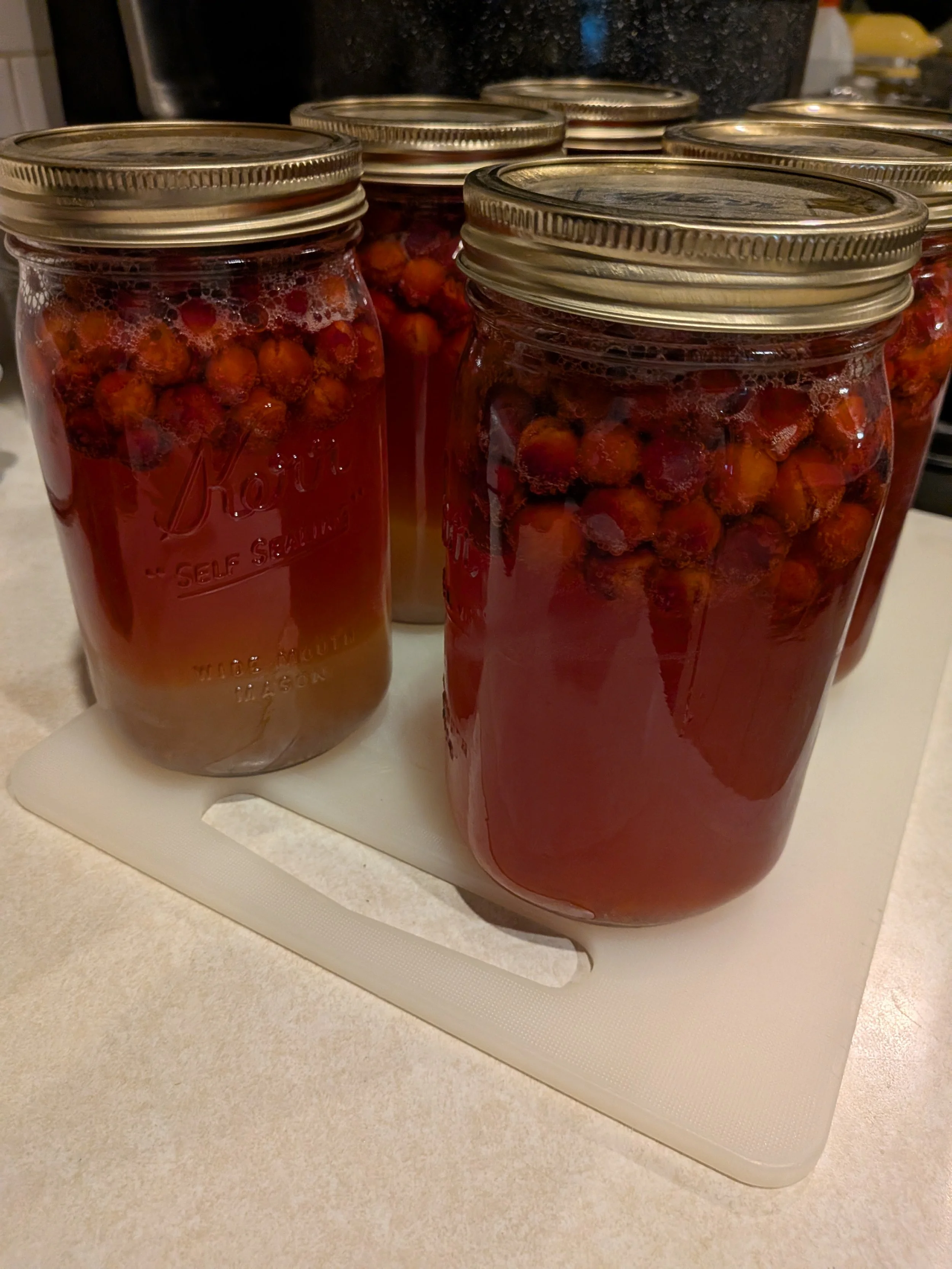The last item I canned in quart jars is Cranberry Sweet Tea. It contains cranberries, an orange slice, cinnamon stick, sugar and black tea. I am very interested in taste testing these in a few weeks.