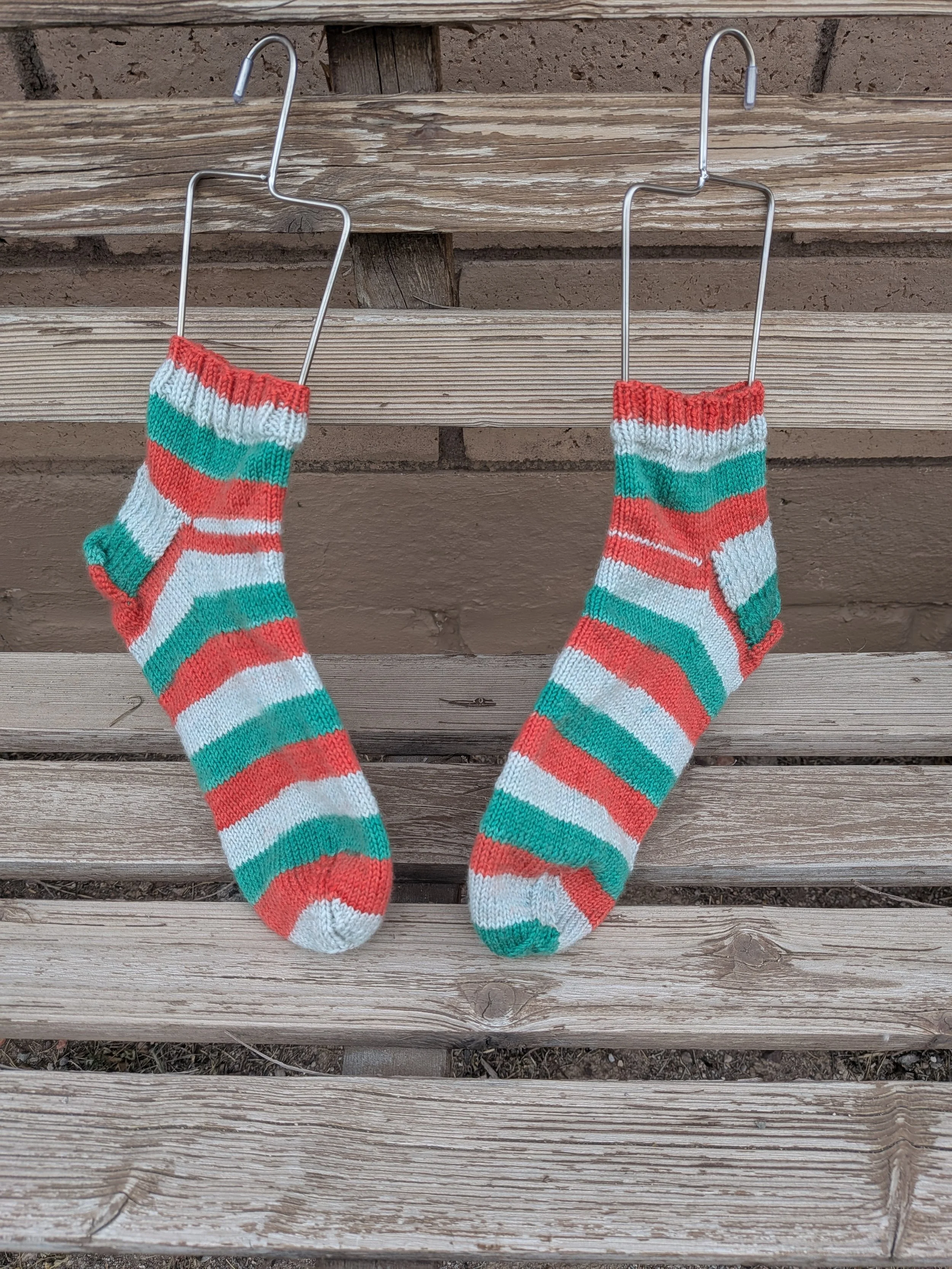 I used Knit Picks Felici in the colorway Buddy. This was marketed as a Christmas yarn and was based on the movie “Elf.” I think they turned out quite nice. They do have both red and green but instead of white the third color is a light grey. The pattern is my own. I just keep track of the rounds and knit until I get to her foot size.
