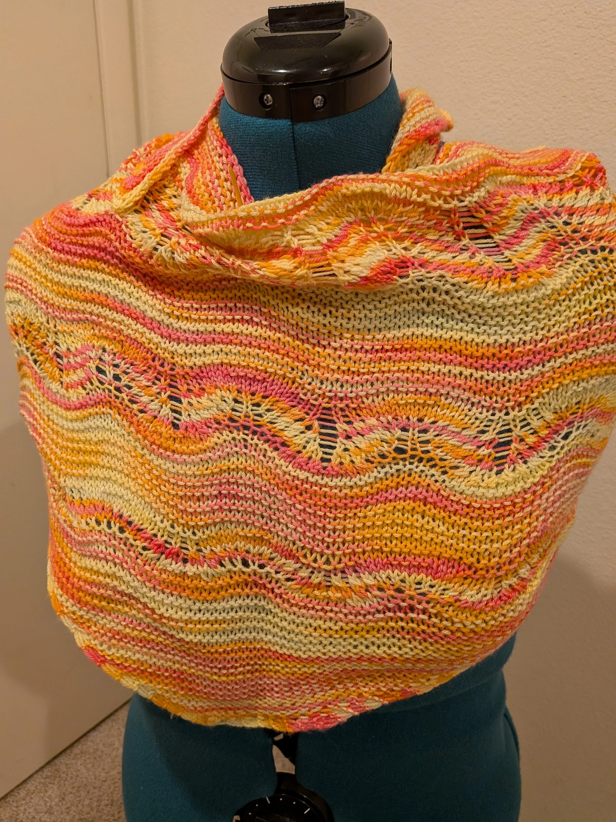 I used a skein of fingering weight from Yarnable. It was the yarn in the May 2024 box called Berry Citrus Bliss. It blocked so nicely. It is a simple scarf, but a stunner.