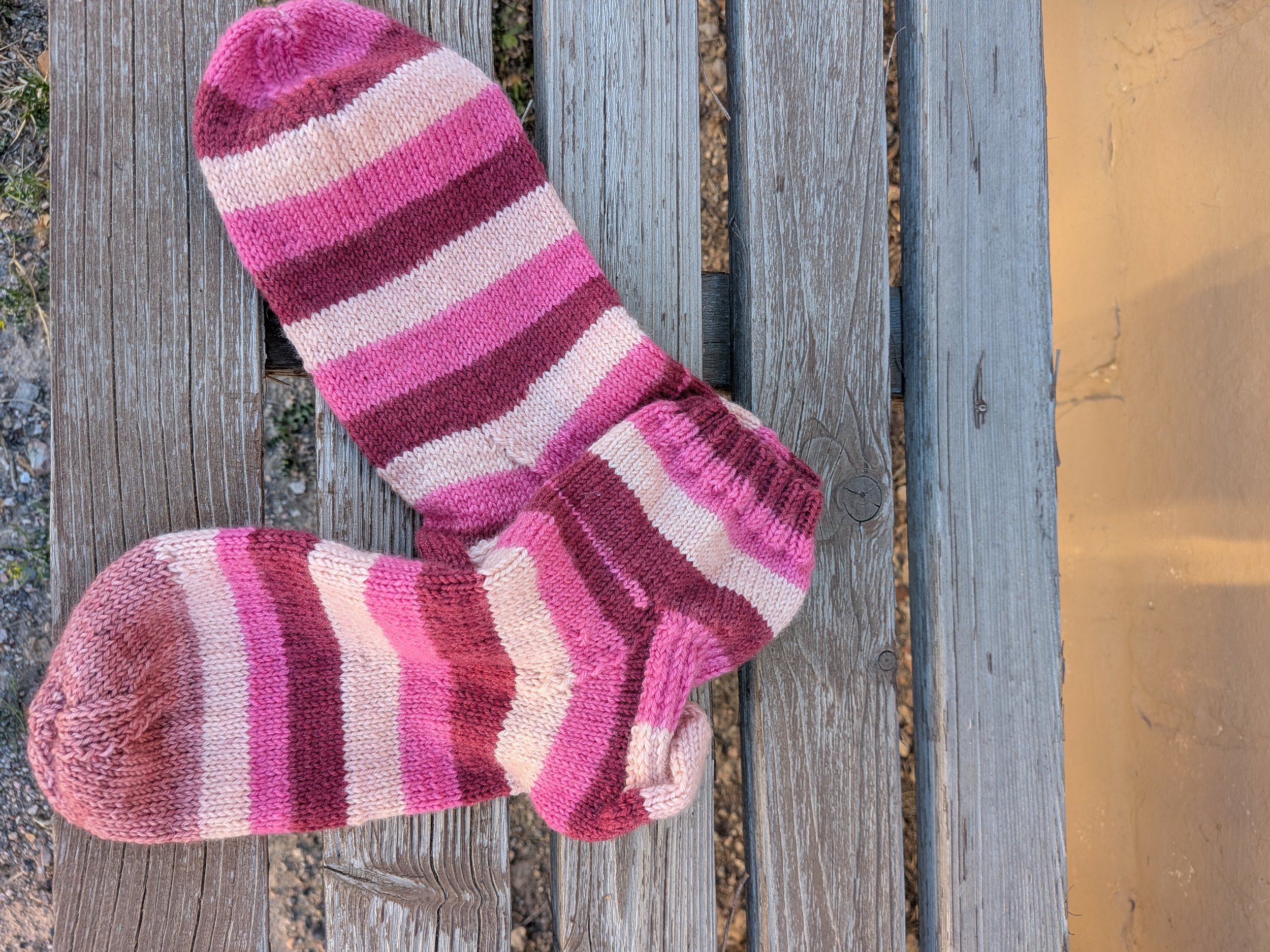 I managed to knit these within the space of one month. They are my second completed knit socks this year. I used my basic sock recipe that I have cobbled together from other socks I have knit in my life. The pattern works, I have it memorized and most importantly the socks always fit.