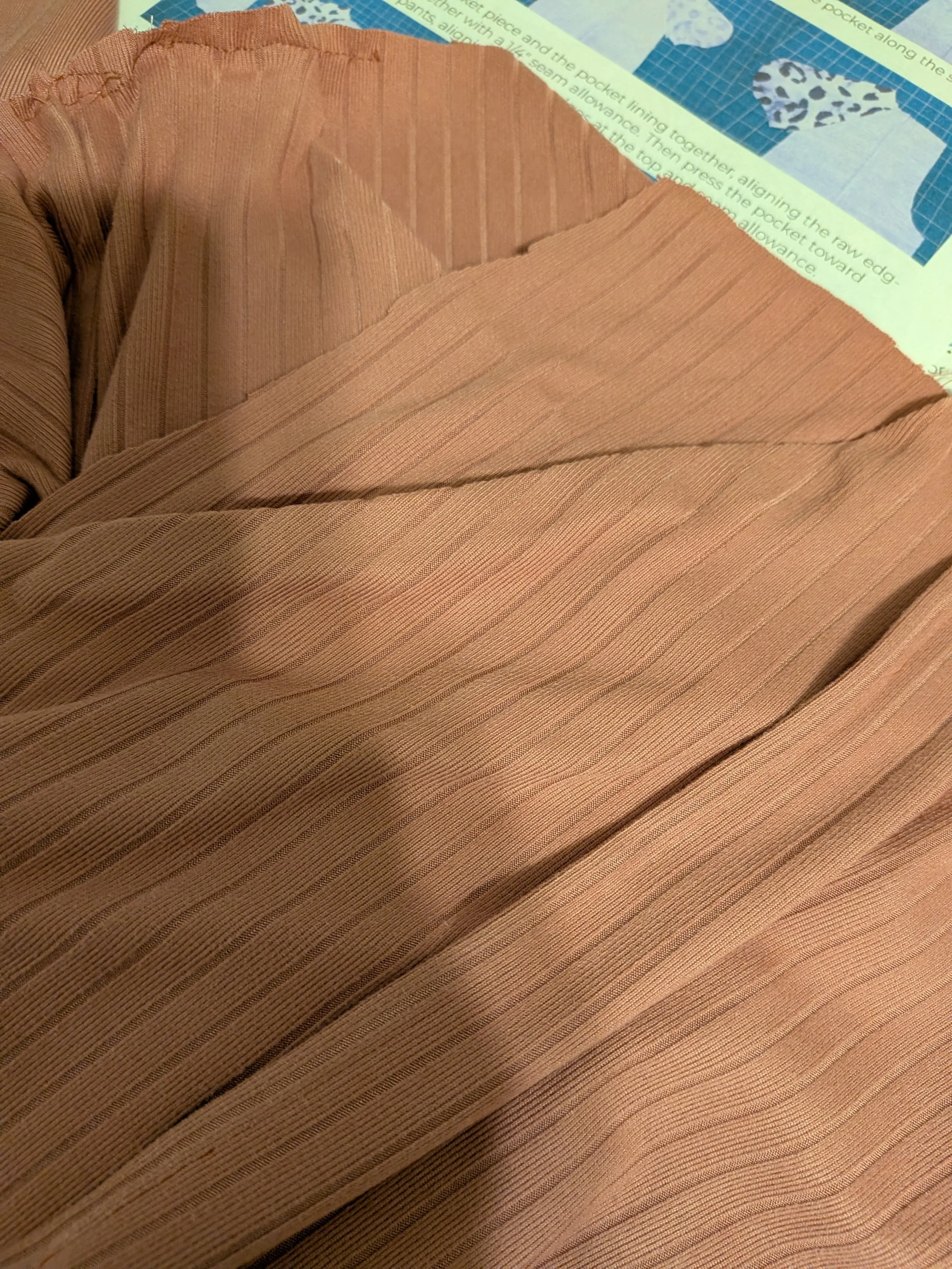 I used a rib knit for my last pair. I will say that the pockets do not hang anywhere as nice with the stetchier knit fabrics. The pocket on the french terry pair I made hung so nicely. The pockets on the less structured knits seem to be more floppy. I even added interfacing to the pocket edges on this last pair and that helped some.