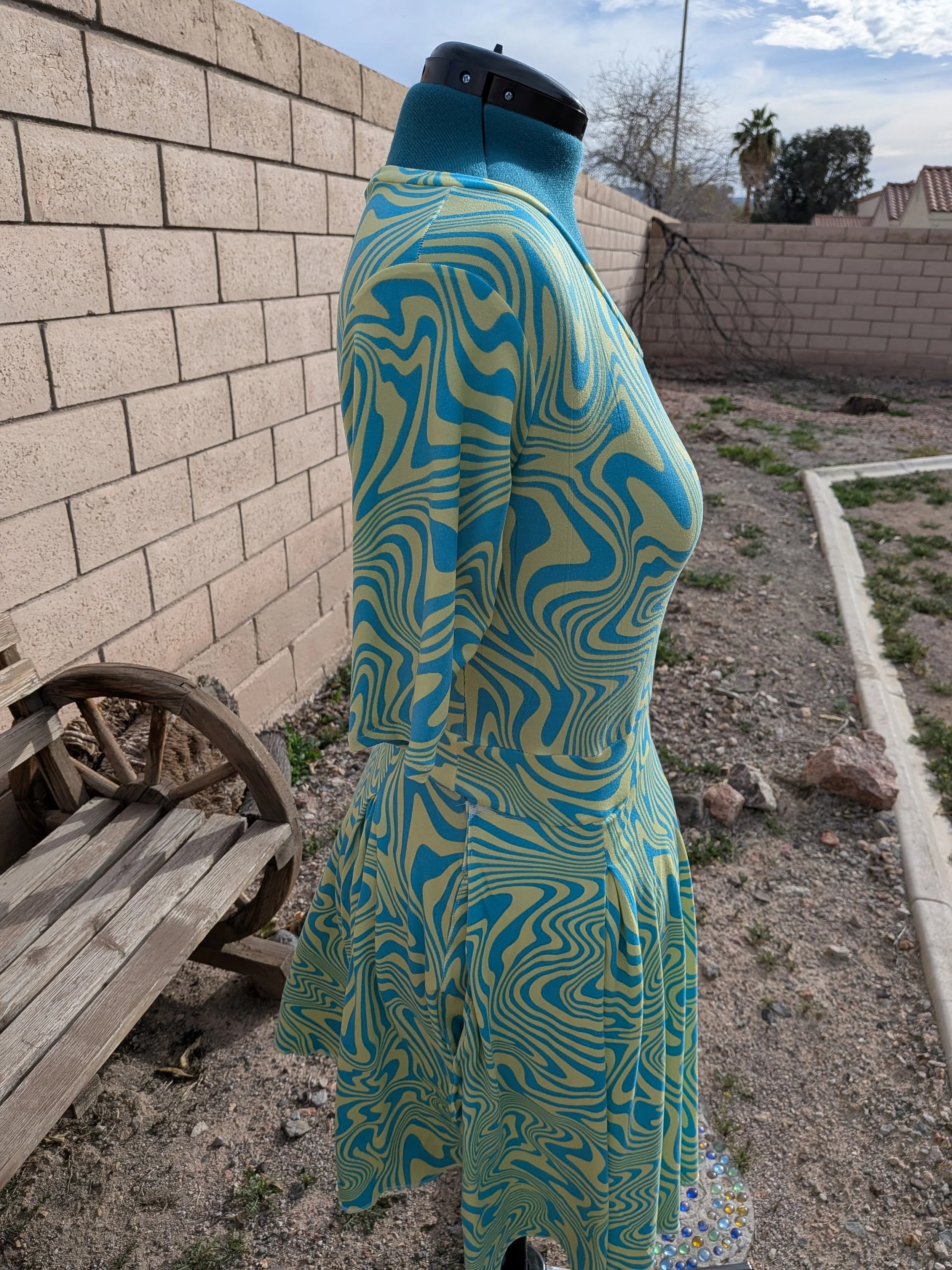 I was a little concerned the fabric might be a tad too much but made into this dress it looks great. The pocket construction was also a little different, but I think they will lay nicer in the end. They look smoother on an actual person, than this picture would have you believe. You can really see the pleat in this photo.
