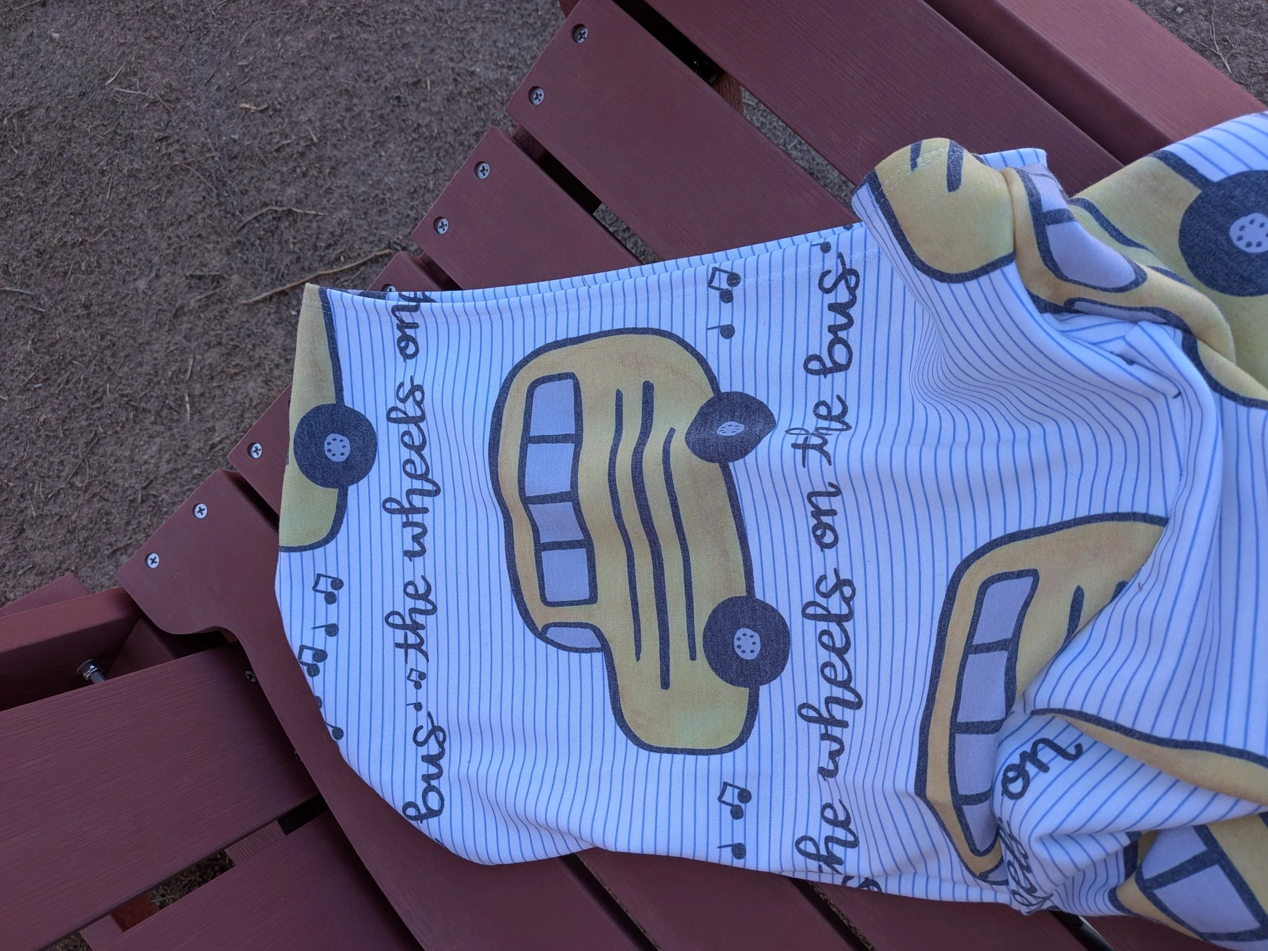 I bought Wheels on the Bus sweatshirt fleece from Raspberry Creek Fabrics at least over a year or more ago (but if you put in the keyword bus on the search feature it will show up for ordering). When it arrived I was a little disappointed in my own ability to visualize scale of the graphic in real life. Can we just all agree that measuring is not my strongest skill. Hence is sat in the collection for quite a while until it called to me.