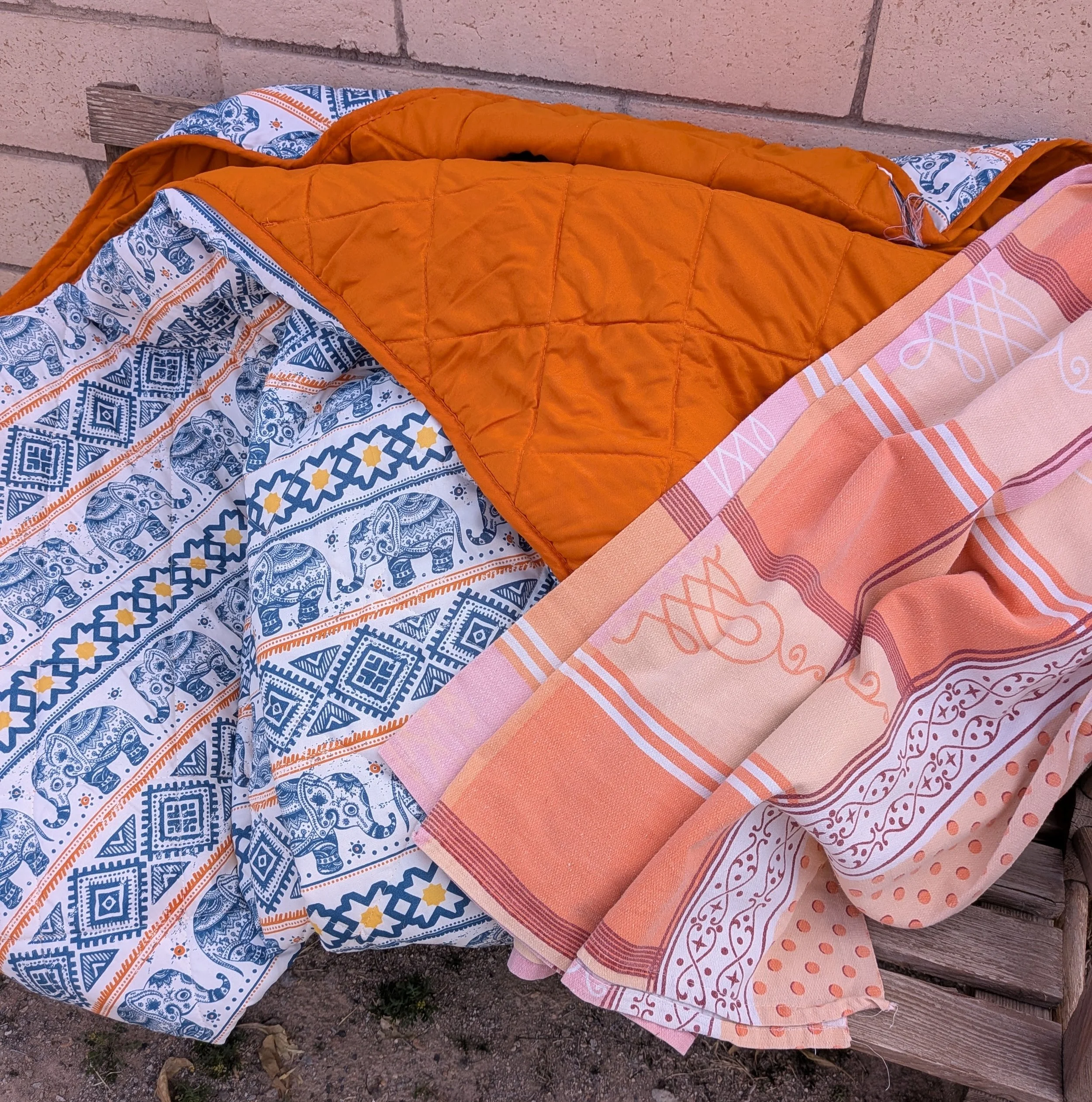 I have plans for the comforters. I love the pattern with the elephants and I do not mind wearing orange. The first item on the agenda is to try to use my trusty seam ripper to remove the edge binding. It will be easier to use the binding off of the piece rather than cutting all the pieces needing binding at the edge. We shall see how that progresses. I am thinking maybe a skirt or summer capri pants for the tablecloth.