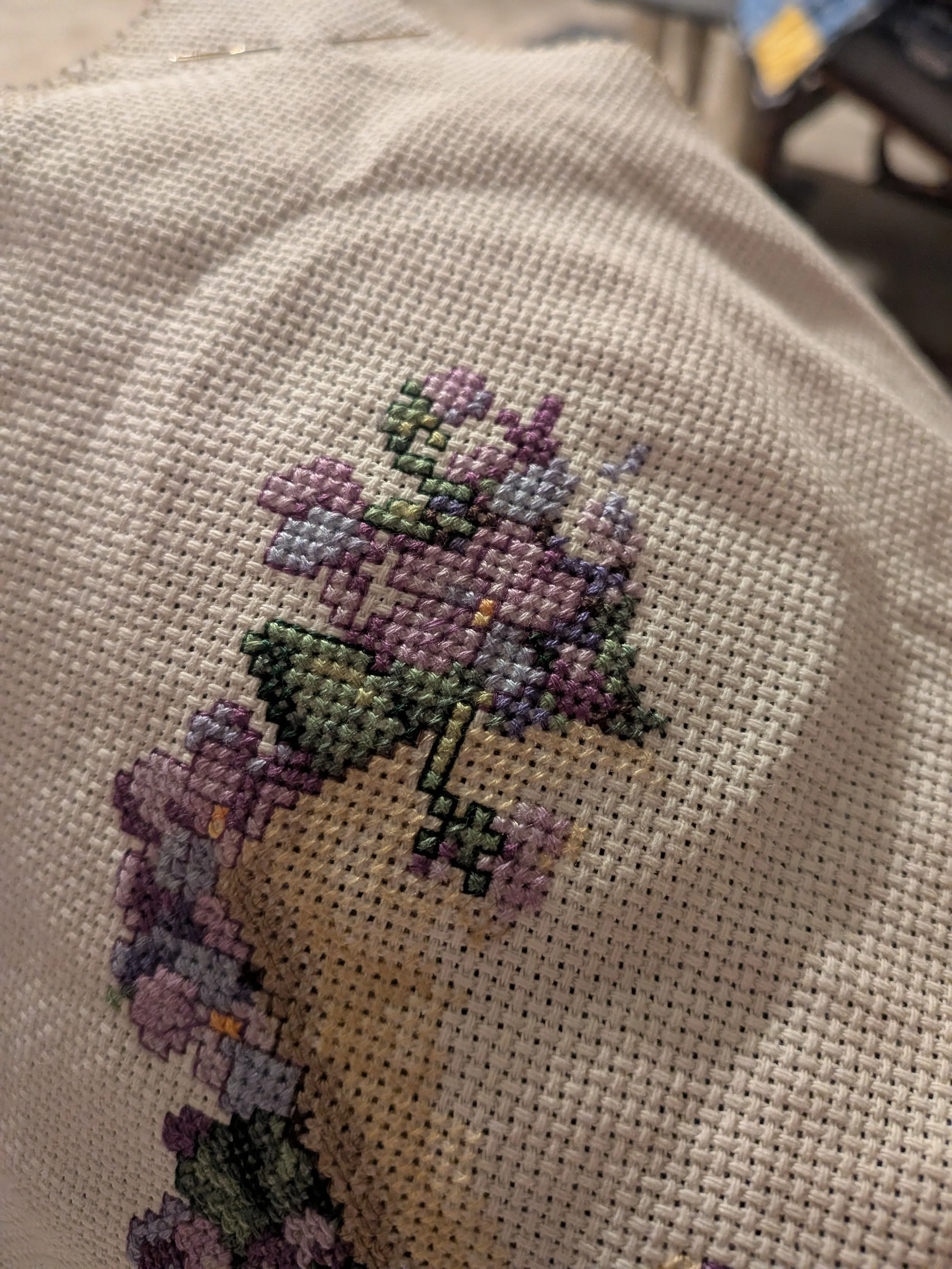 I did a few Xs this week but also spent some time outlining previous stitching. The grand total of colors for the hour was 6. I keep thinking I should be closer to the matching side than I actually am. This is why the monthly progress shots are helpful. About the third hour of each month I begin to think I have made no progress.